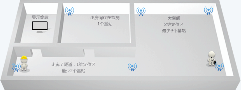 二維定位: 系統(tǒng)在平面區(qū)域邊沿架設(shè)基站,遇到柱子、墻壁等阻擋源需要增加基站,并為基站供電供網(wǎng)。